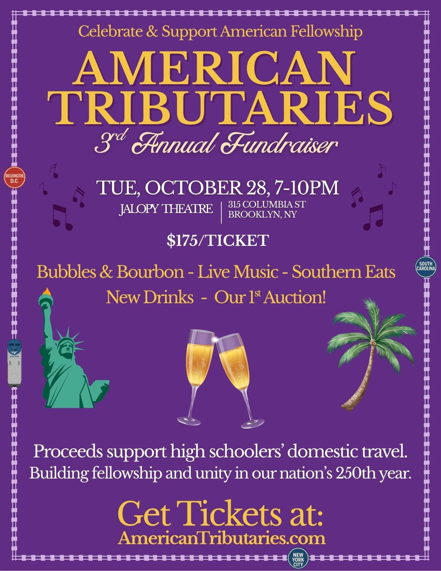 Each ticket purchased will help cover the costs for eight students and two chaperones to make another bridge-building New York City / South Carolina trip, promoting understanding, trust and fellowship between two quite different regions which nevertheless share our intertwined, unavoidably-flawed but forever-aspiring American heritage.